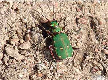 De groene zandloopkever komt graag op wat licht begroeide plaatsen.