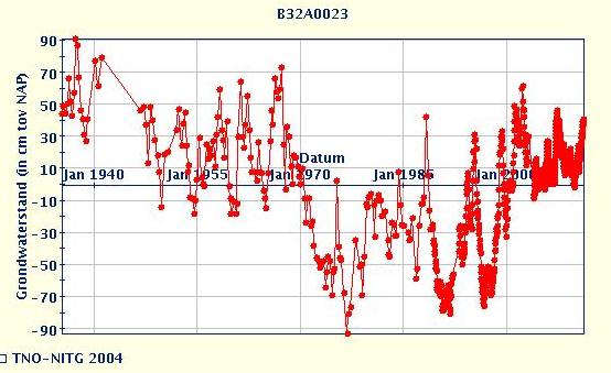 De grafiek geeft het verloop van de grondwaterstand weer. Te zien is dat de grondwaterstand sinds 1935 gemeten is.