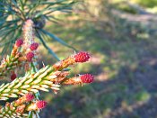 Deze rozerode bloemen rijpen in twee jaren tot de bekende dennenappel die de zaadjes herbergt.