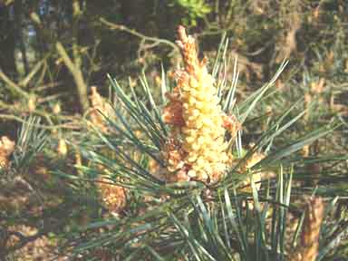 De zwavelgele kegels van de mannelijke bloemen vallen op door het grote aantal en de kleur. Als het stuifmeel los komt zie je gele sluiers rond de bomen zweven.