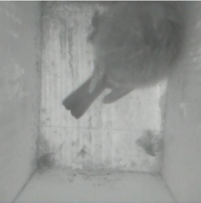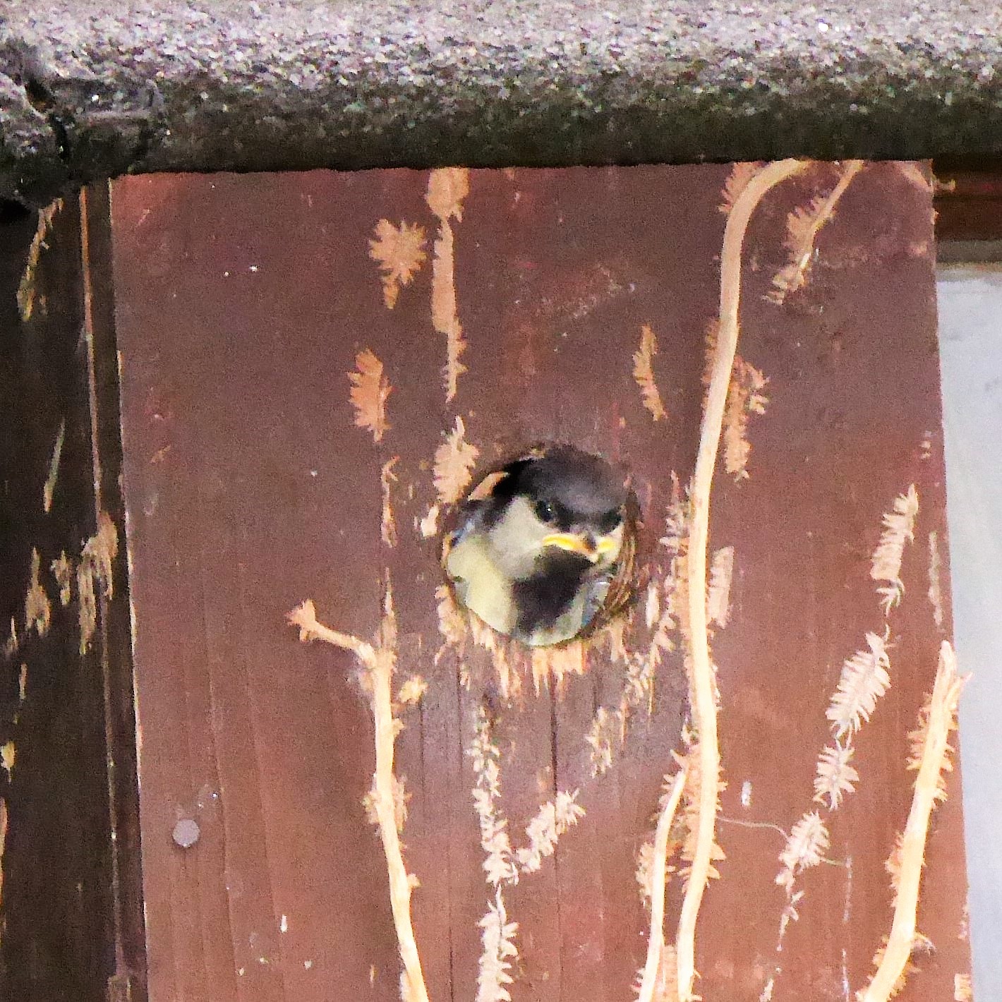 17 Mei 09 uur. Het eerste jong kijkt uit het nestkasje. |