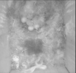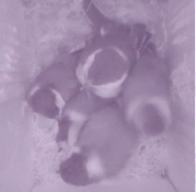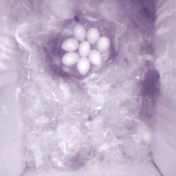 Een eerste blik op eitjes. Hoeveel zijn het 5? Iedere dag wordt een eitje gelegd en zorgvuldig toegedekt, zodat alle eitjes tegelijk uitkomen. Pas als het legsel compleet is begint het broeden. Er komen er dus meer bij. |