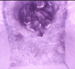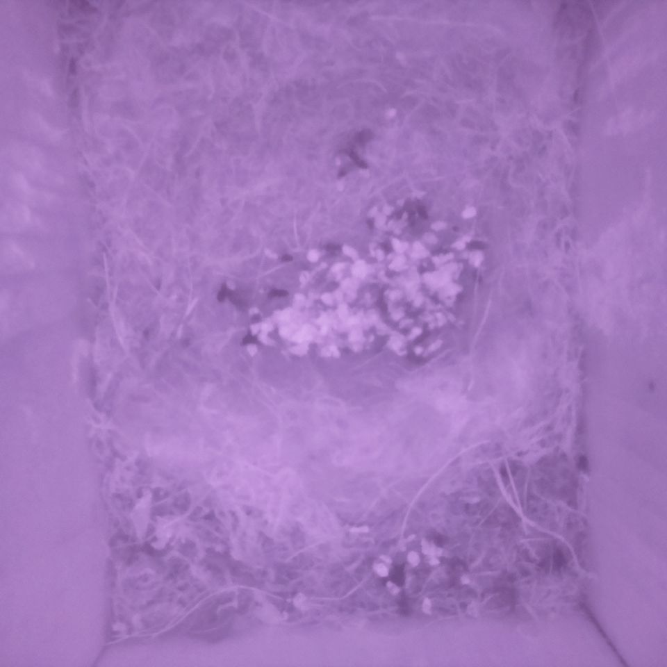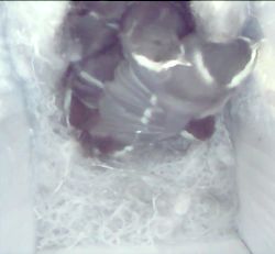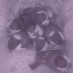 1 week oud. Ze zijn al gegroeid. 7? koppies richting vlieggat waar het voer vandaan komt. |
